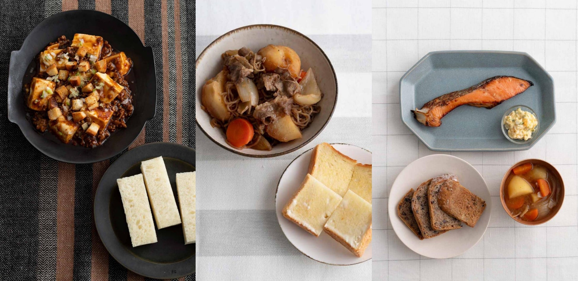左から「麻婆豆腐withパン・ド・ミ」「フライパン肉じゃがwithパン・ド・ミ」「焼き魚パン定食with雑穀パン」