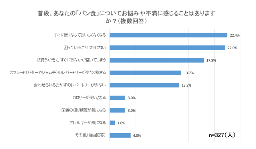 「すぐに固くなっておいしくなくなる」(22%)他、「腹持ちが悪い」(18%)、食べ方の「レパートリーの少ない」(約3割)という結果に。他に、「カロリーが高い」「栄養の偏り糖質が気になる」「アレルギーが気になる」など、パンのデメリットを気にする人もいた。