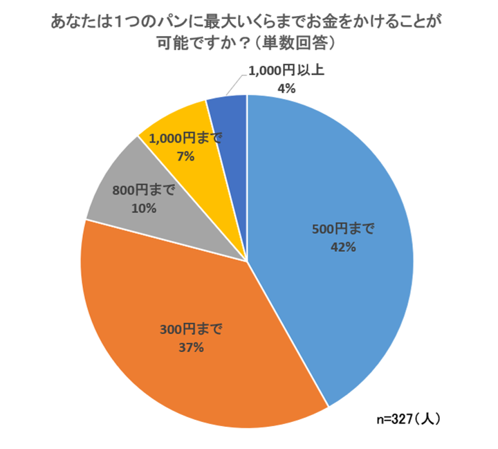 「300円まで」(37%)を除いた6割以上の人が、1つ500円~1000円以上の高額なパンを購入可能と回答。1000円以上の高いパンを購入するのは40代以上の女性が多かった。好きなパンにはいくらでも払うという人もいた。