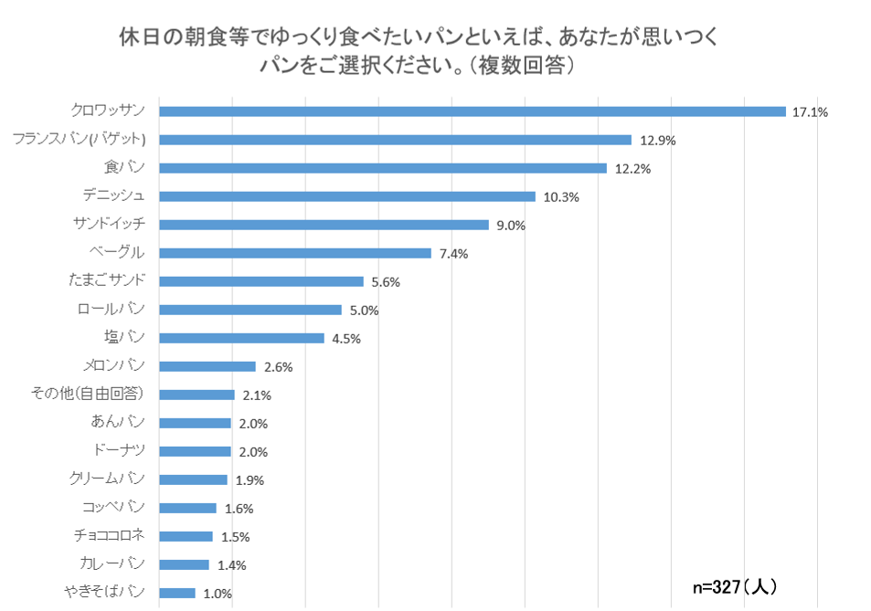 休日に食べたいパンは、好きなパンランキングの上位4位までと同じ銘柄。好きなパンをゆっくり食べたいと思う人が多い。
