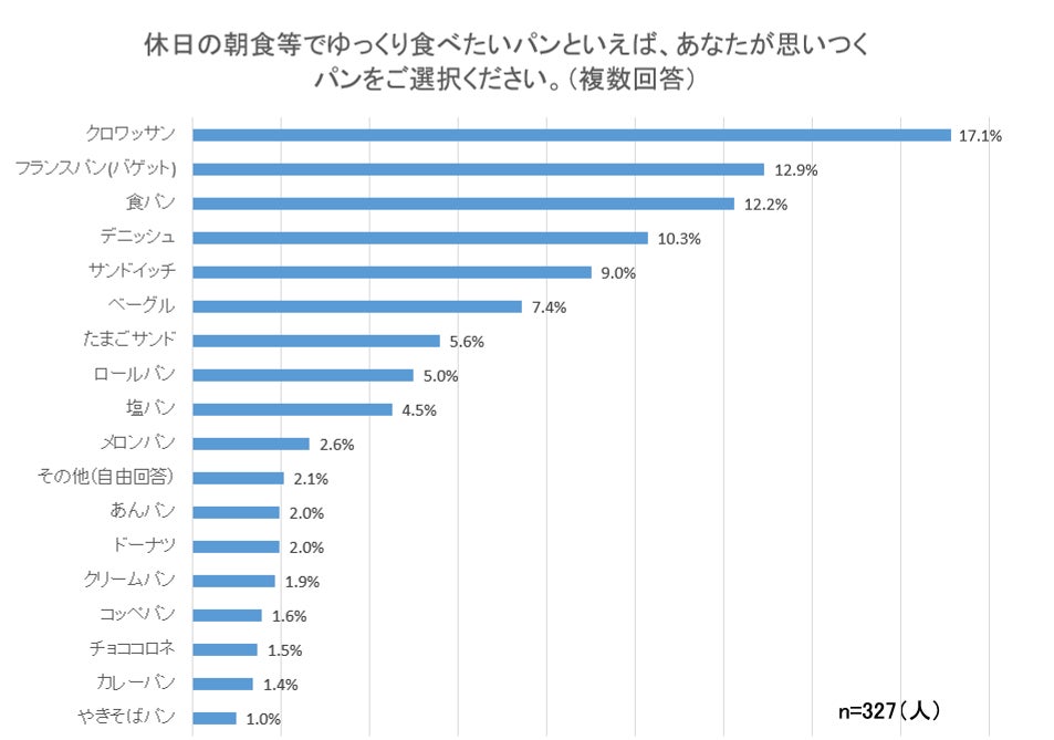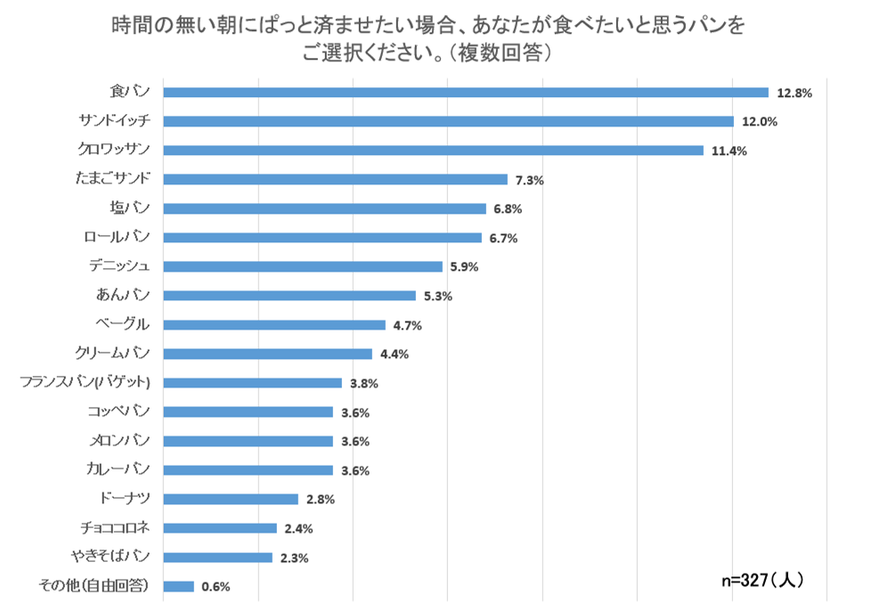 朝、忙しいときにぱっと食べたいのは「食パン」(約13%)「サンドイッチ」(12%)「クロワッサン」(11%)。休日の朝にゆっくり食べたいパンは「クロワッサン」が堂々の1位
