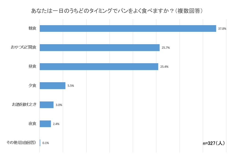 1位は「朝食」(約38%)、次いで「おやつなど間食」(約26%)、「昼食」(約25%)で食べる人が多かった。「おやつなど間食」と答えた人は、チョコパンやカレーパンなど、菓子パンや総菜パンをよく食べていました。一方で、「夕食」で食べる人は5%程度に留まった。