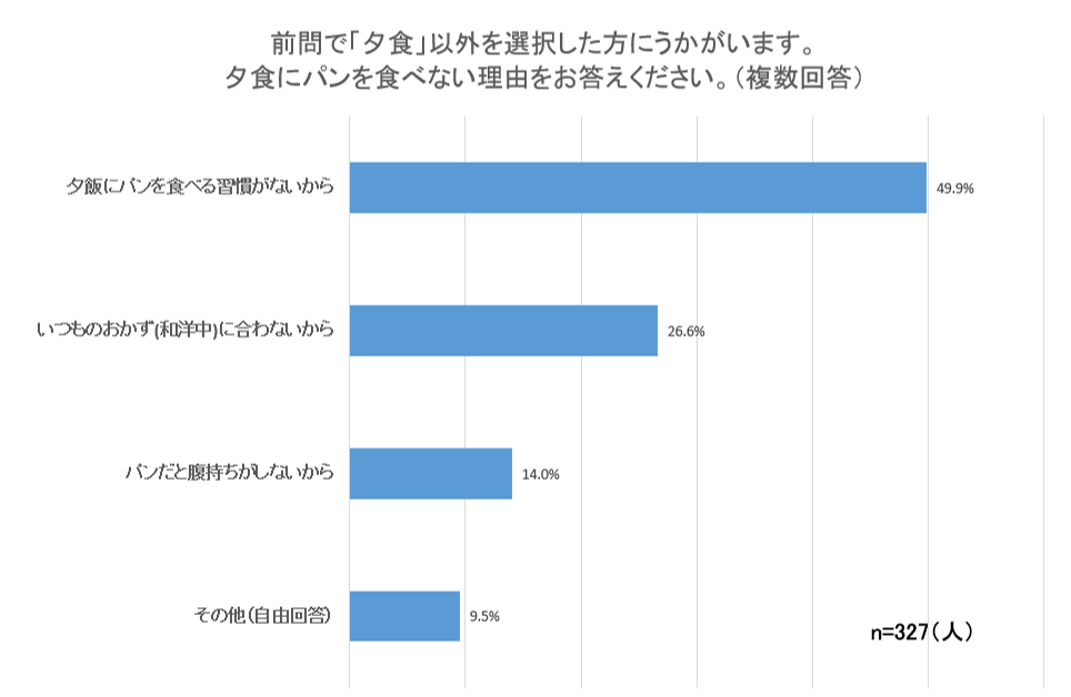 約半数が「夕食にパンを食べる習慣がなく」、約3割が「いつものおかず(和洋中)に合わないから」と回答。