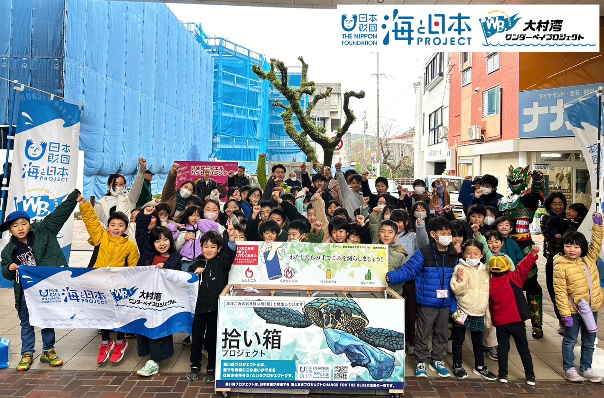 拾い箱を活用した清掃活動後は、諫早市中心市街地商店街協同組合連合会が主催の「節分豆まき」イベントにも参加し、節分というイベントを楽しんでいました。