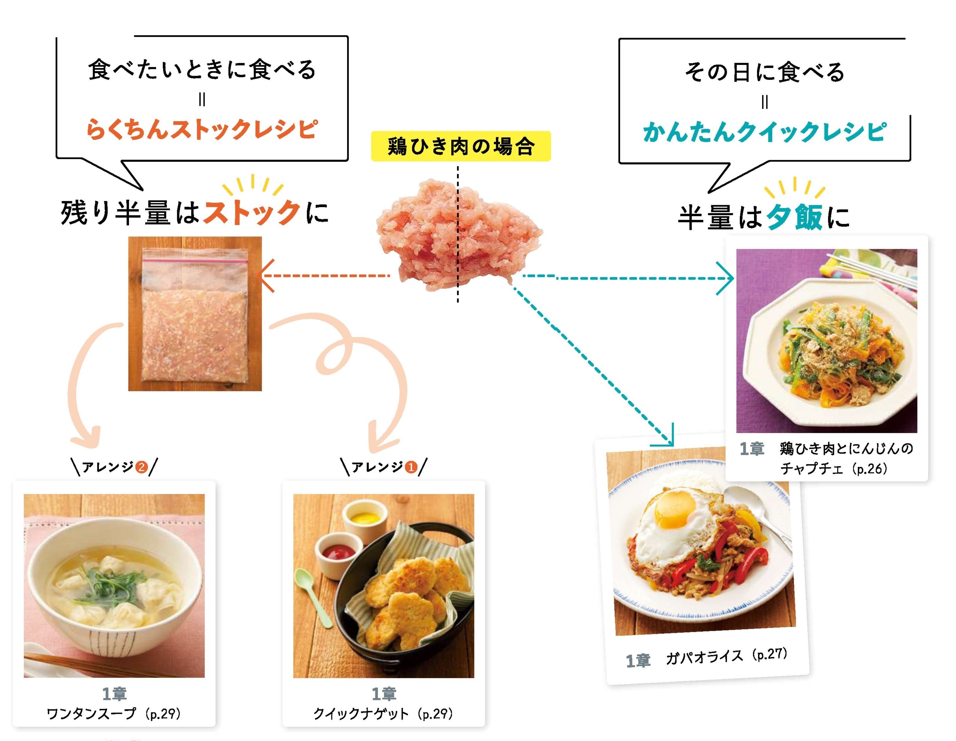食材の半量や一部で夕飯(時短おかず)を作りながら、残りで作りおき(ゆるストック)を仕込むシンプルな方式です。たとえば、鶏ひき肉の場合はこんな感じ。