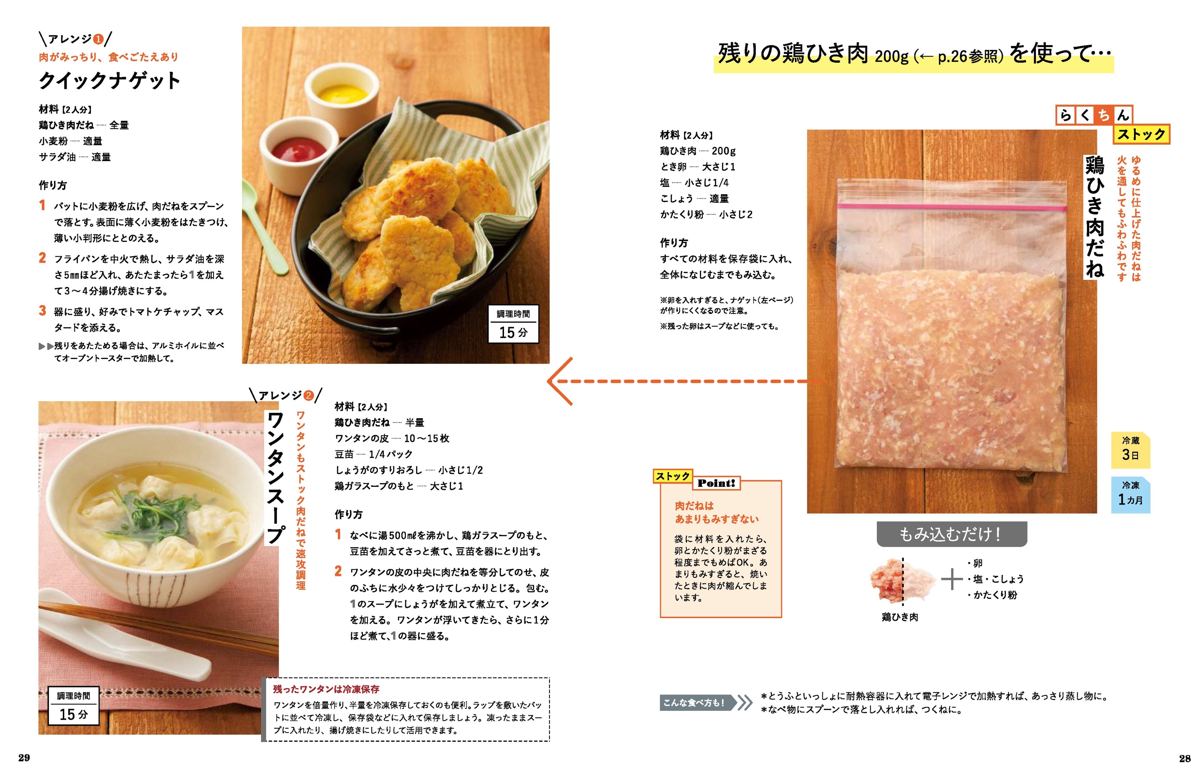 同じ食材の残りで作る【ストック】は、調味料とあえておくだけ、切って冷凍しておくだけ、レンジで加熱しておくだけなど、数分で済むものばかり。