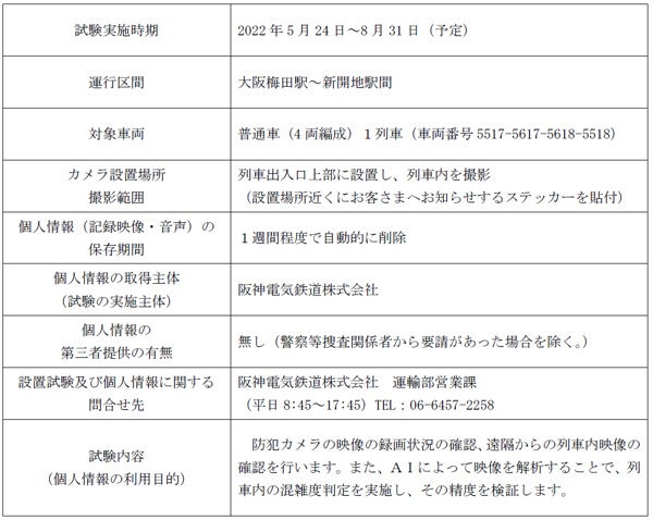 阪神電車では、本試験を通じて得られる知見をもとに、列車内のセキュリティレベルの更なる向上と、お客さまに安心いただける車内環境の整備及び充実した顧客サービスの提供を目指してまいります。