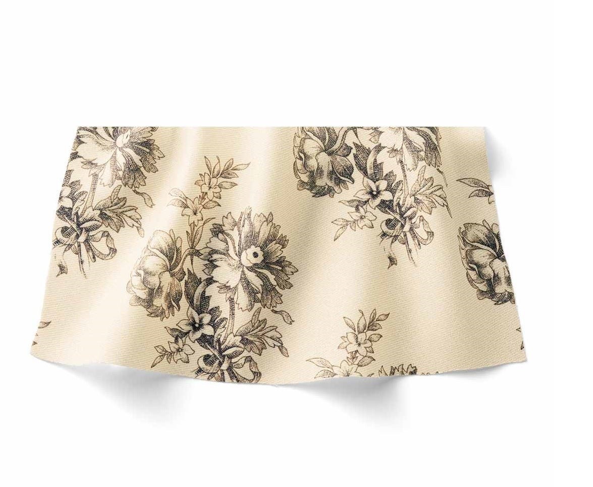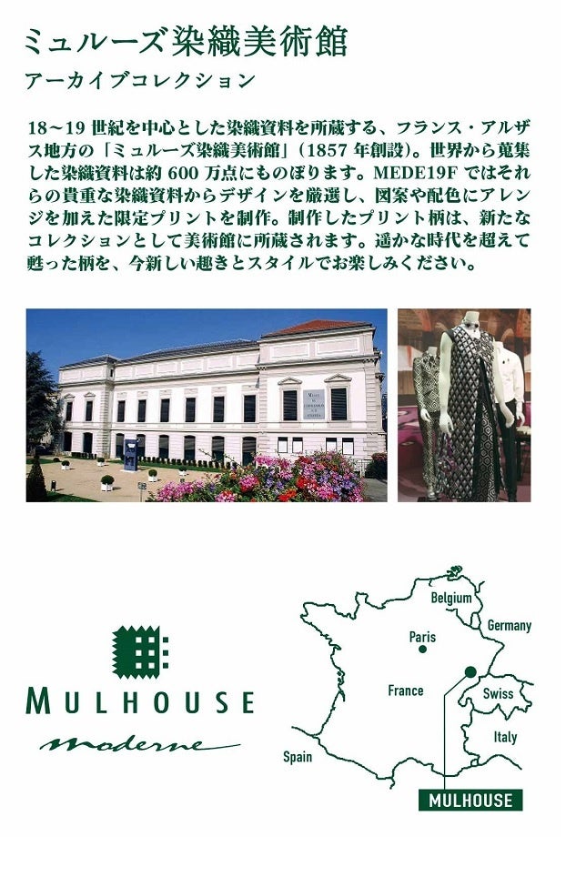 18~19世紀を中心とした世界各地の染織資料を収蔵するフランス・アルザスの「ミュルーズ染織美術館」。MEDE19Fではその貴重なアーカイブからデザインを厳選し、図案や配色アレンジを加えた限定プリントを制作。ヴィンテージ柄ならではの味わいを現代のプリント技術で精巧に再現し、遥かな時代を甦った柄を今着たいアイテムへと落とし込んでいます。