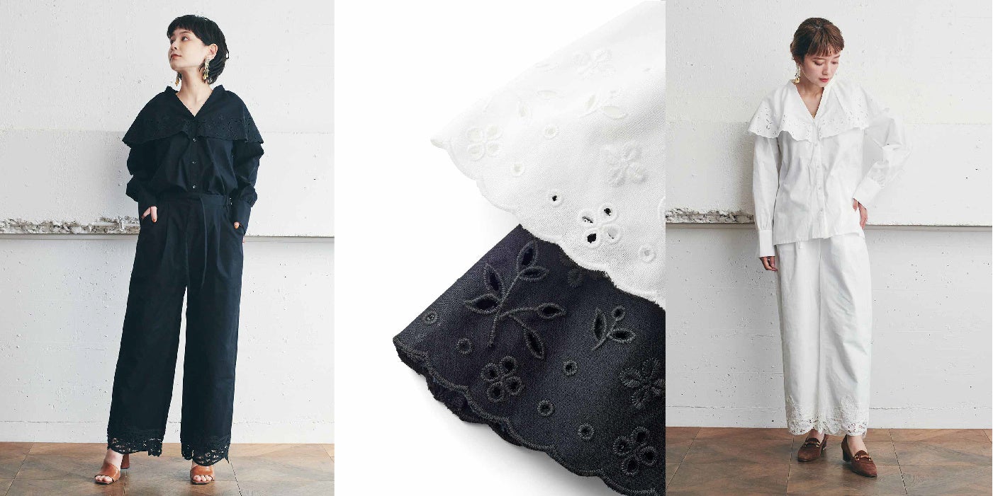 春らしいカットワーク刺しゅうを、思い切りよくデコラティブにあしらった遊び心のあるブラウスとヴィンテージのペチパンツをイメージしたバテンレース遣いのコットンパンツです。すそのレースを生かしたレイヤードスタイルにも映え、組み合わせてセットアップ風コーデとしても相性抜群です。