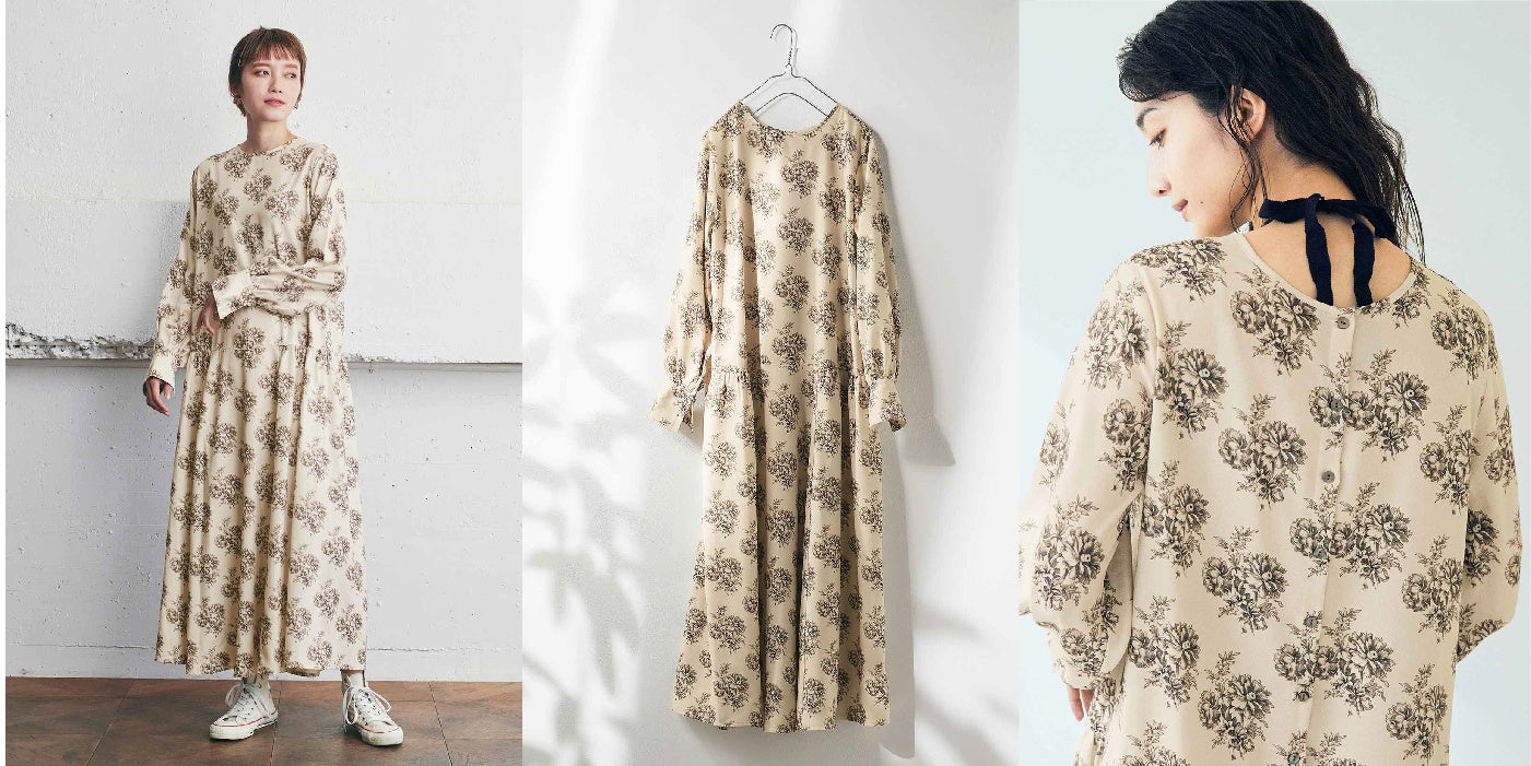 すそにかけてたっぷり広がるシルエットが印象的なワンピースです。ロングカフスのふんわりした袖もクラシカルで、さまざまなシューズと合わせやすいロング丈。繊細な線画をベースにした単色の陰影が美しいブーケ柄をセレクトしています。