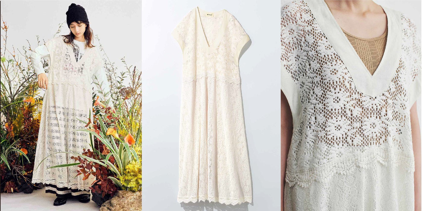 ちょっと野暮で懐かしいムードのクロシェ風レースを組み合わせた大人のためのロングドレス。カジュアルなスタイルに重ねて対比させる、遊びのあるコーデを楽しめます。胸もとのVの開きと肩口を麻の布はくで切り替えて、さらりとクールに。製品洗いをかけてヴィンテージ感を高めています。