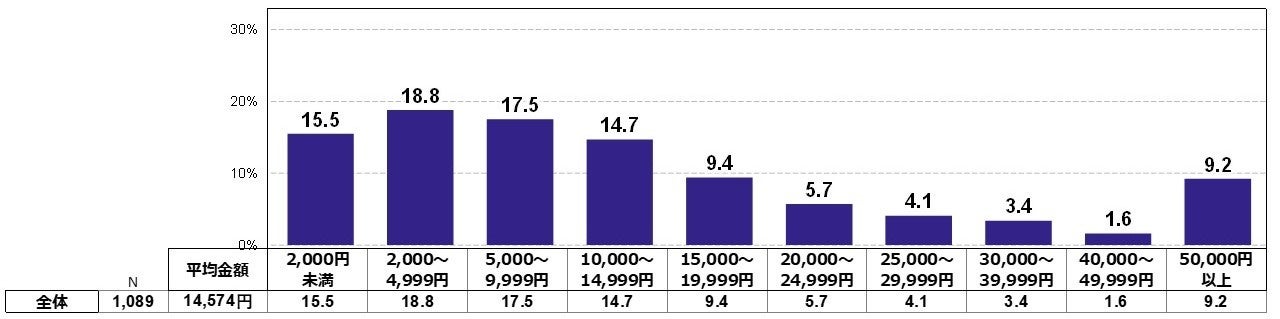 過去1年以内に自分用に購入した玩具の総額を調査したところ、「2,000~4,999円(18.8%)」の割合が最も大きく、次いで「5,000~9,999円(17.5%)」「2,000円未満(15.5%)」の割合が大きいという結果になりました。