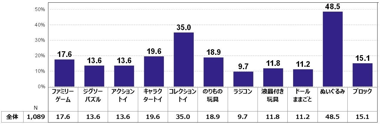 過去1年以内にキダルト層が購入した玩具・キャラクターグッズについて、本調査におけるキダルト商品(11カテゴリ)に限定すると、「ぬいぐるみ(48.5%)」が約半数となり最多であると分かりました。次いで「コレクショントイ(35.0%)」が多い結果となりました。