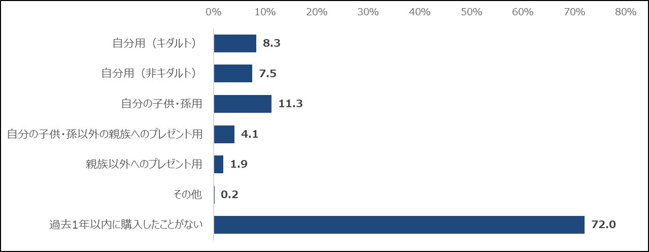 全国の18~60歳の男女(15,875名)のうち、「過去1年以内に自分用に玩具を購入した人」の割合は15.8%という結果になりました。そのうち、「玩具売り場にて展開されているキダルト商品を購入した人」の割合は8.3%であり、この割合を人口推計(総務省統計局)の18~60歳男女の人口に当てはめると、「535.4万人」のキダルトが存在することが推定されます。また、本調査における玩具を購入していない層(72.0%)についても、ライフステージの変化等で玩具商材とのタッチポイントが増えることで、キダルト市場はさらなる拡大の可能性が見込まれます。