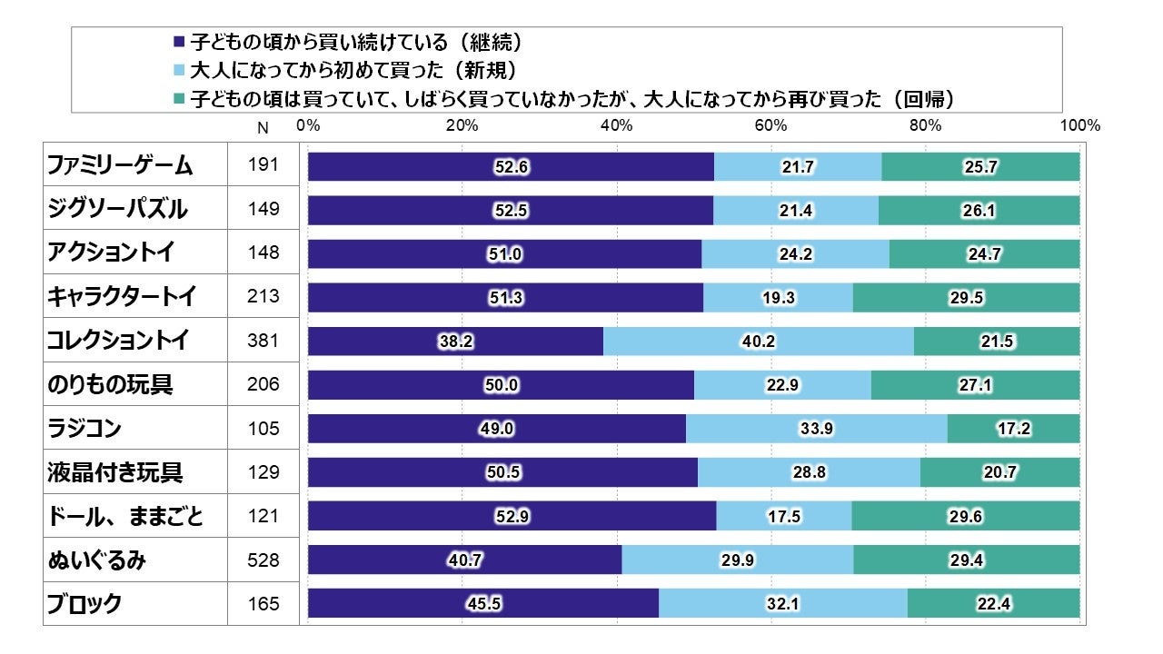 コレクショントイは、「大人になってから初めて買った(新規)」層の割合が最も大きくなる傾向がみられました。