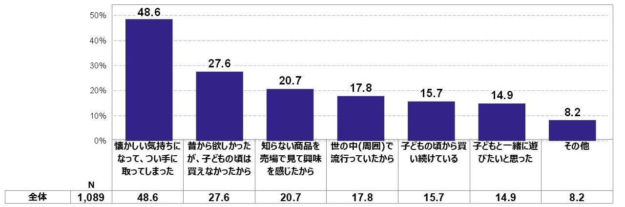 3)大人が玩具を購入する理由は「懐かしさ」や「子ども時代の憧れ」、約半数が“つい手に取ってしまった”経験あり