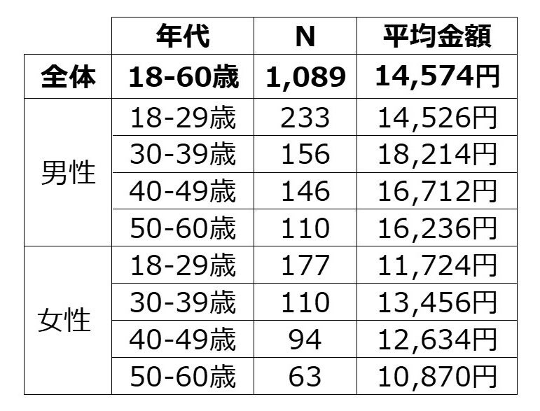 性年代別で比較すると、平均金額が最も高いのは「男性30~39歳(18,214円)」であることが分かりました。また、どの年代でも女性より男性の方が平均金額が高い傾向が見られました。