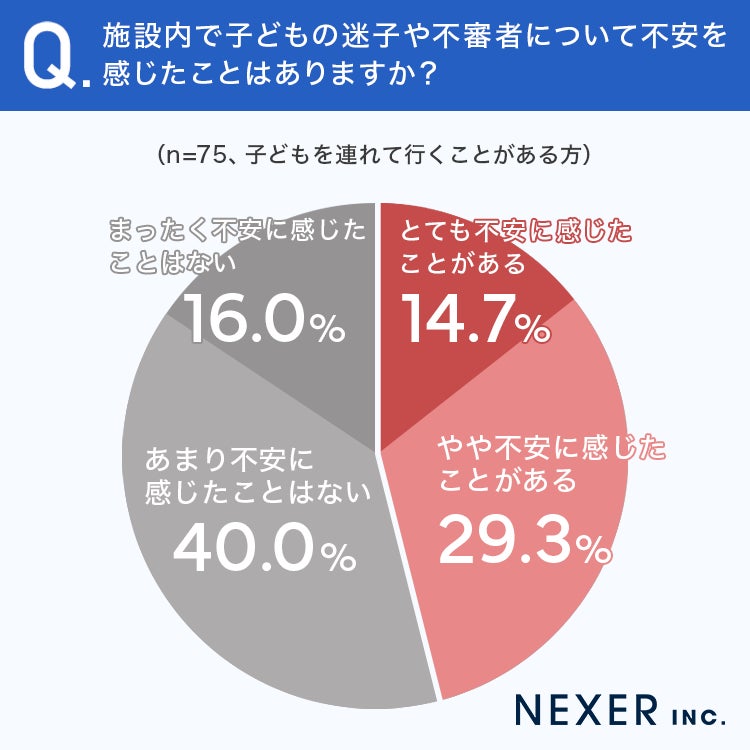 あわせて、子どもを連れて行くことがあると回答した人に、施設内で迷子や不審者について不安を感じたことがあるか聞いてみました。