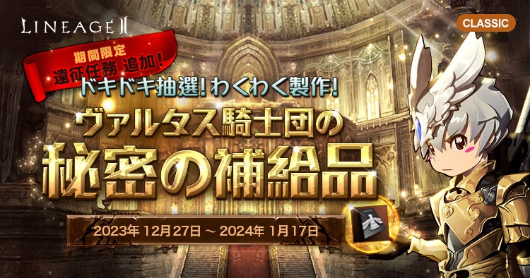 PC向けオンラインゲーム『リネージュ2』をサービス、運営しているエヌ・シー・ジャパン株式会社(東京都港区、代表取締役:金 澤憲(キム テクホン))は、2023年12月27日(水)に、ライブサービス/クラシックサービス/アデンサービスでの各種イベントの開催をお知らせします。