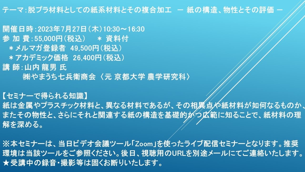 【ライブ配信セミナー】脱プラ材料としての紙系材料とその複合加工 ― 紙の構造、物性とその評価 - 7月27日(木)開催 主催:(株)シーエムシー・リサーチ