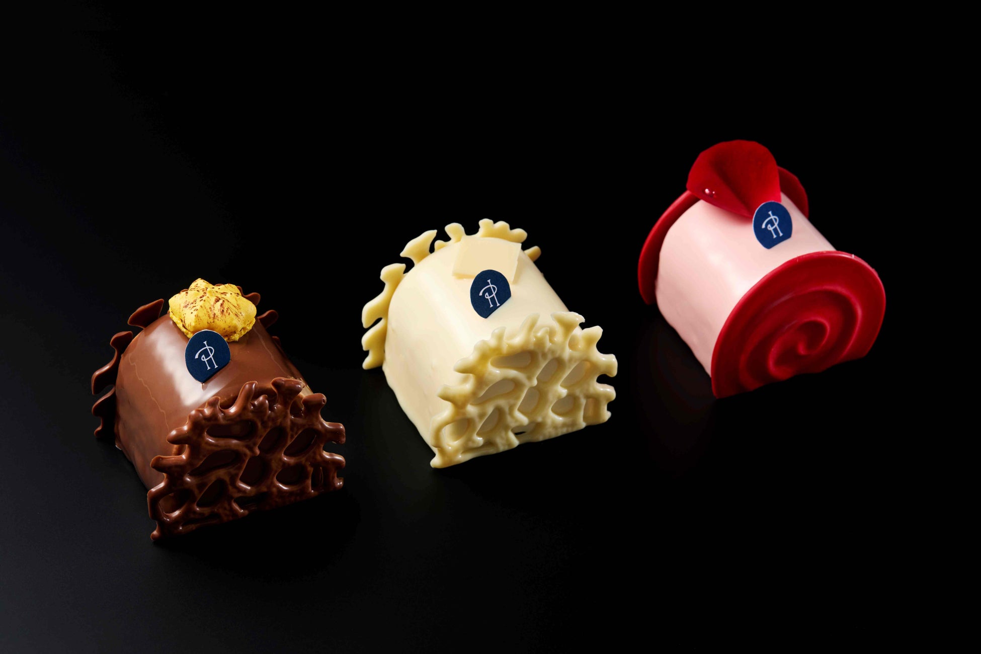 左から、ショコラと甘酸っぱいパッションフルーツが絶妙に釣り合った「ビュッシュ モガドール」、メープルシロップ風味マスカルポーネクリームを使用した「ビュッシュ キャレ ブラン」、ローズとライチ、フランボワーズが織りなす「ビュッシュ イスパハン」
