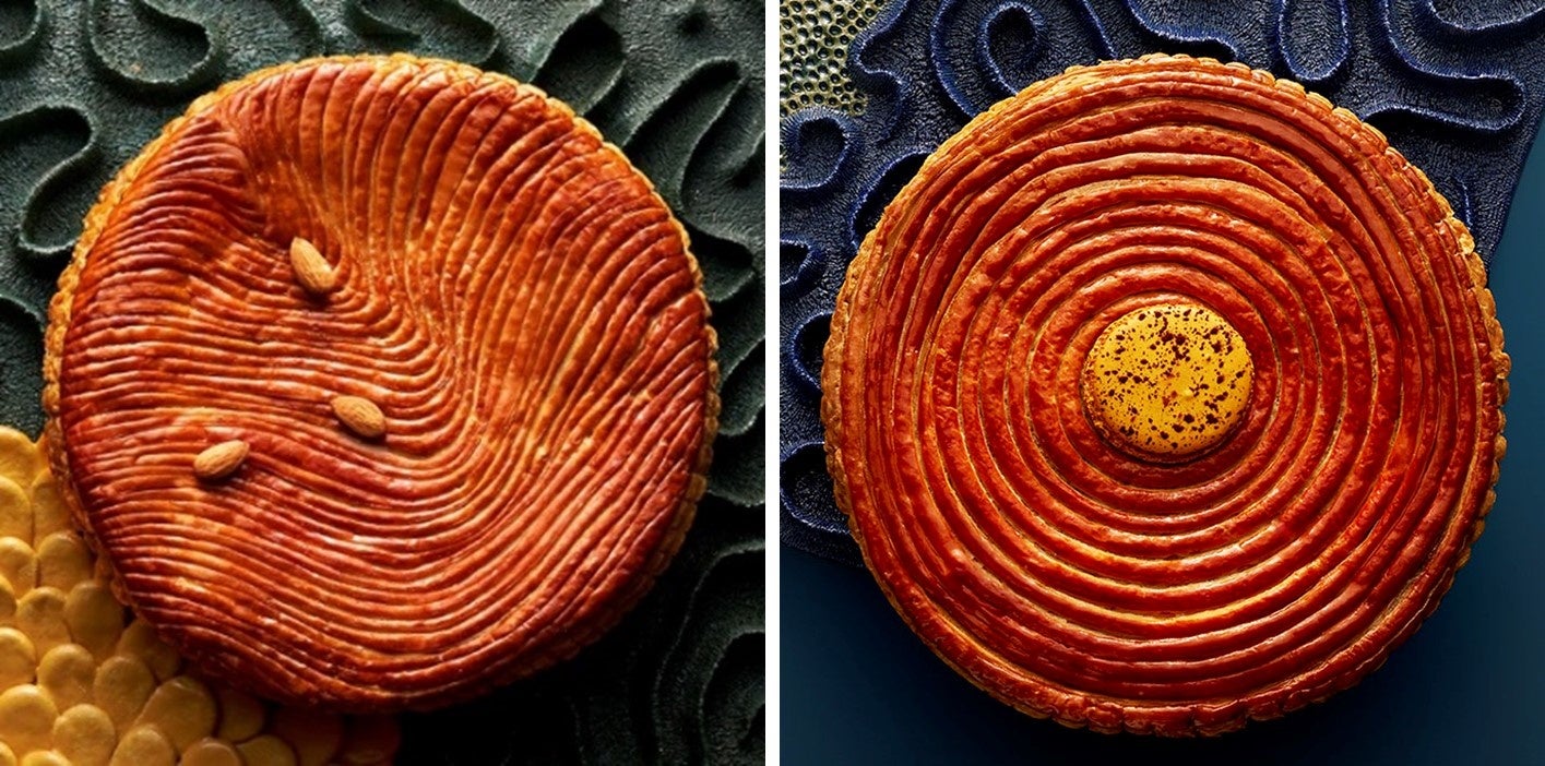ピエール・エルメ・パリの「ガレット・デ・ロワ 2026」は、昔ながらのガレット・デ・ロワを見直して、アーモンドの新たな一面を壮麗に盛り立てています。程よく焙煎されてこの上ない風味になったアーモンドが、ガレットの真ん中に行きわたって、心地よい歯ごたえのスイーツの魅力を生み出しています。さくさくとした食感がある金色のパートフィユテと、香ばしい炒りアーモンドとの間で展開される完璧なコントラストの妙をお楽しみください。「ガレット・デ・ロワ モガドール」は、ピエール・エルメ・パリの代表作のひとつであるモガドールを、ガレット・デ・ロワの特別バージョンにふさわしくアレンジしました。パッションフルーツの香りをアーモンドクリームの中に溶け込む一方、フルーティなガナッシュとカラメリゼしたローストパイナップルが甘酸っぱい風味をかもしだしています。さくさくとした食感の本品を一口味わったら有頂天になってしまうでしょう。