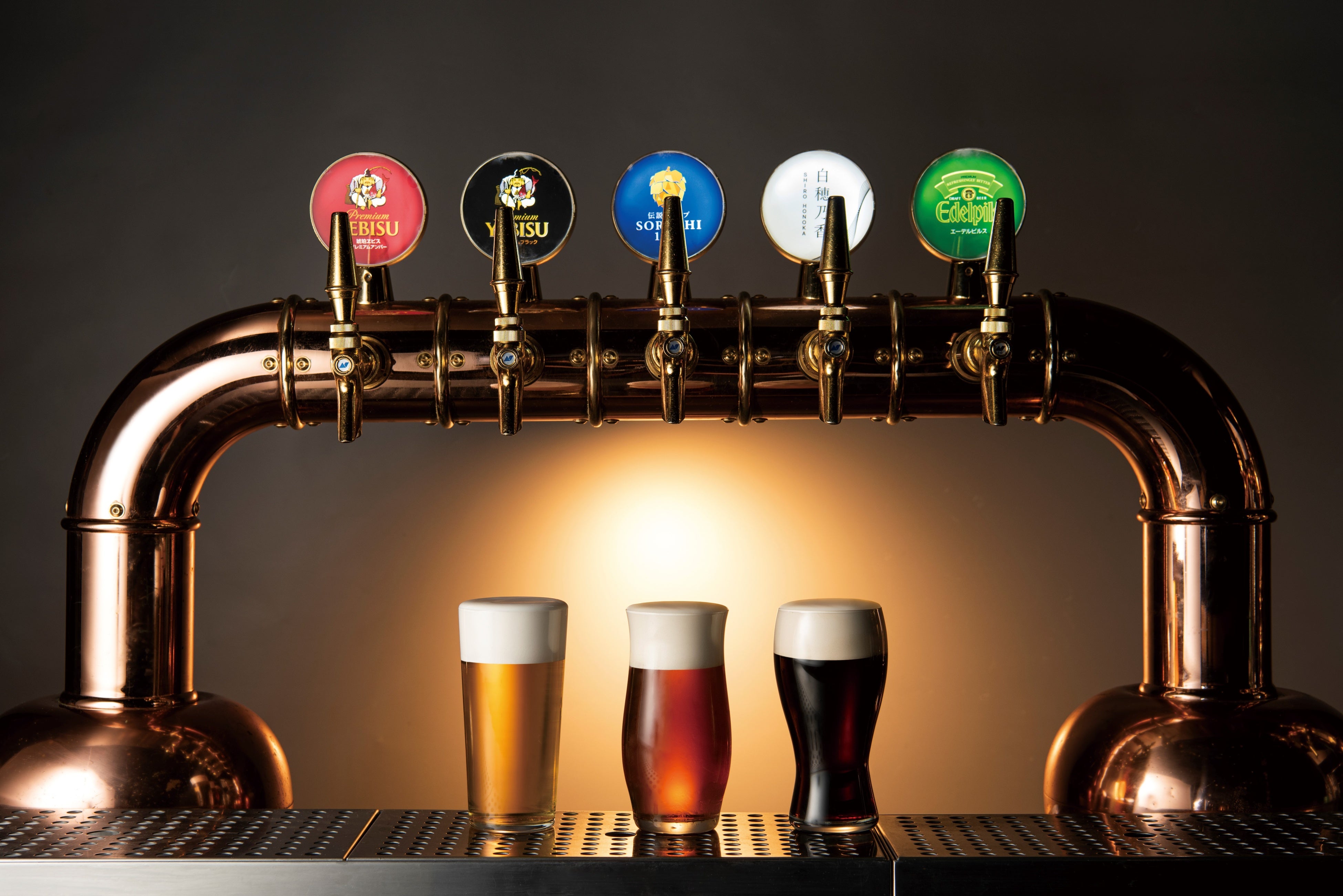 生ビールはヱビス プレミアムブラック・琥珀ヱビス プレミアムアンバー・SORACHI 1984・白穂乃香・エーデルピルスの5種類から、グラスは爽快・芳醇・重厚の味わいたいタイプによって形状の異なる3種類から選ぶことができます。