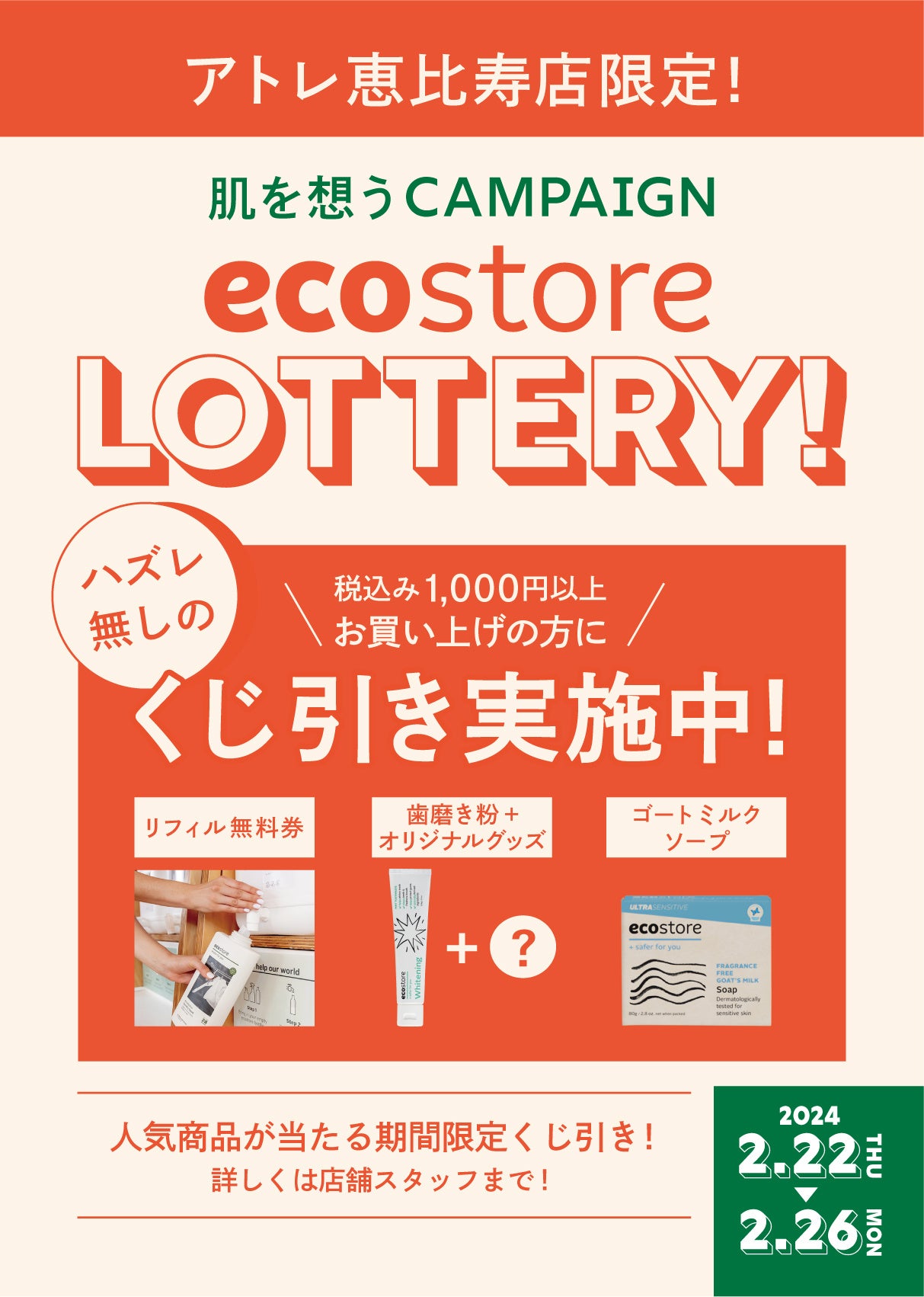 2月22日(木)に、ecostore直営店のアトレ恵比寿店がフルリニューアル。ハズレなしのくじ引きキャンペーン『ecostore LOTTERY!』を実施し、お買い物プラスαの楽しさを提供します。