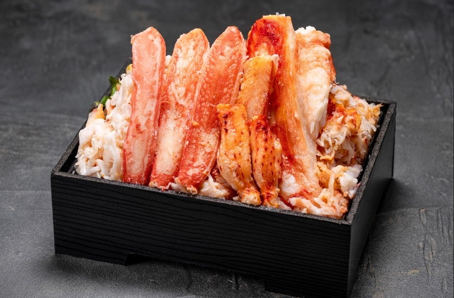 タラバガニ、花咲ガニのほぐし身を盛々にのせ、タラバガニ・毛ガニ・花咲ガニ・ズワイガニの脚肉を盛り付けました。