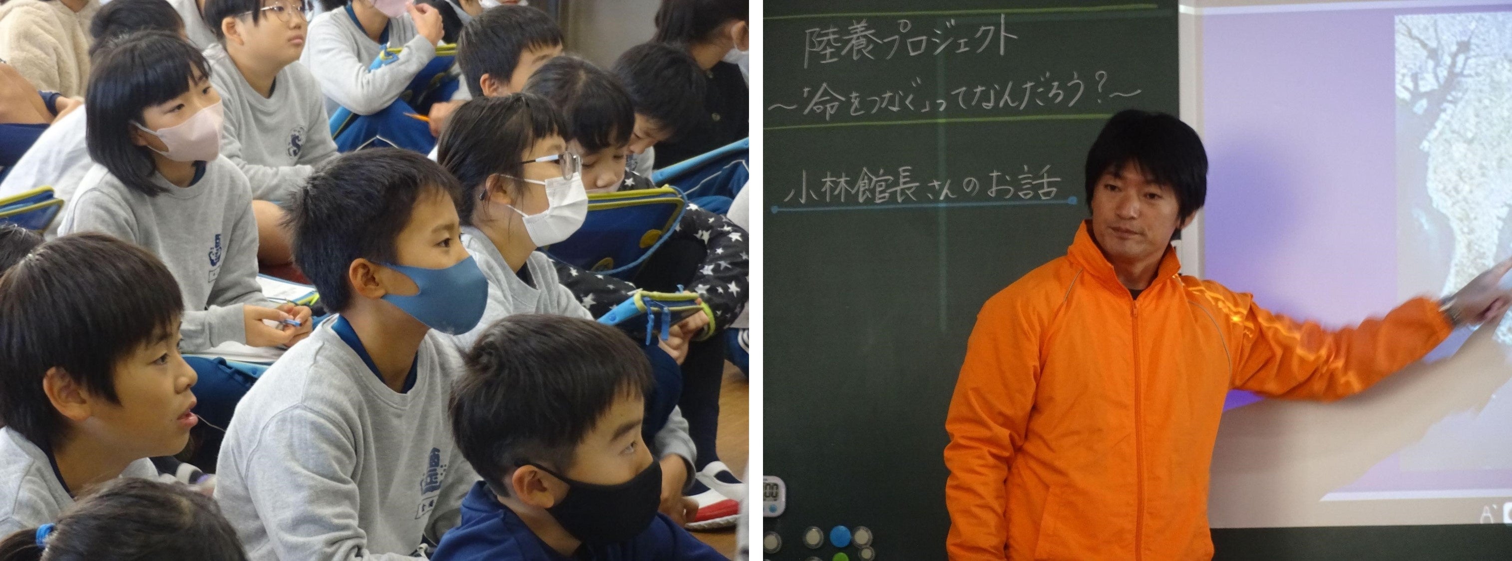 今回、参加校の一つである愛知県蒲郡市立塩津小学校で「特別授業」を行いました。「特別授業」は、陸上養殖体験と平行し、身近な海とそこに暮らす生き物や海とつながる環境・生態系全体について地元地域の専門家から学びます。海と人とのつながりを実感し、環境や生態系の保全の重要性を“自分ごと”として捉えられることを目的とした授業です。