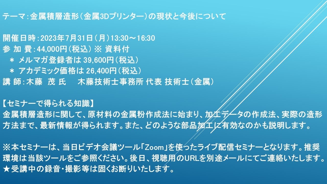 【ライブ配信セミナー】金属積層造形(金属3Dプリンター)の現状と今後について 7月31日(月)開催 主催:(株)シーエムシー・リサーチ