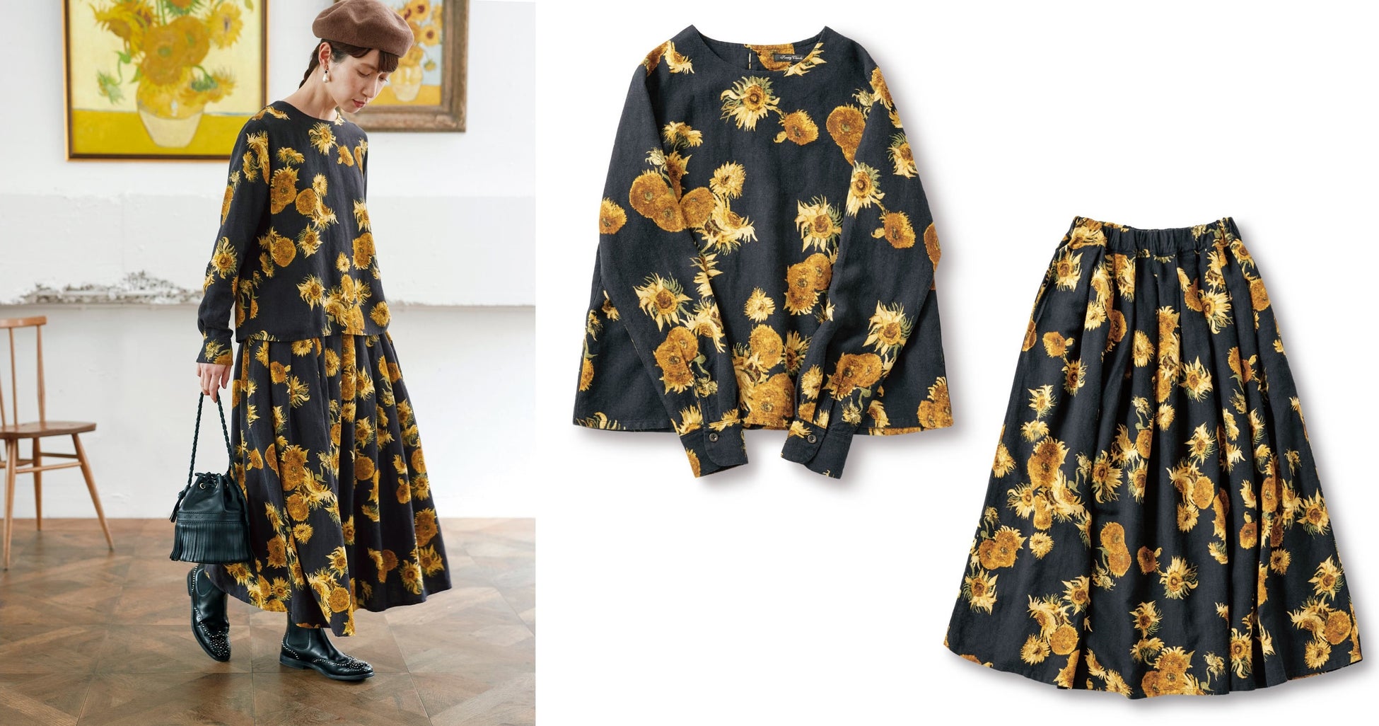 色彩画家とも呼ばれるゴッホの代表作『ひまわり』。画家仲間たちと芸術家の共同体を作りたいと願い、そのアトリエに12枚のひまわりの絵を飾るために『ひまわり』は描かれました。しかし、そのときに描かれたのは4枚のみ。その後3枚の『ひまわり』を制作しましたが、その後ひまわりを描くことはなかったそうです。「ゴッホのひまわりトップス&スカート」は、印象的なひまわりを総柄に。柄を際立たせるため、デザインはシンプルにしています。