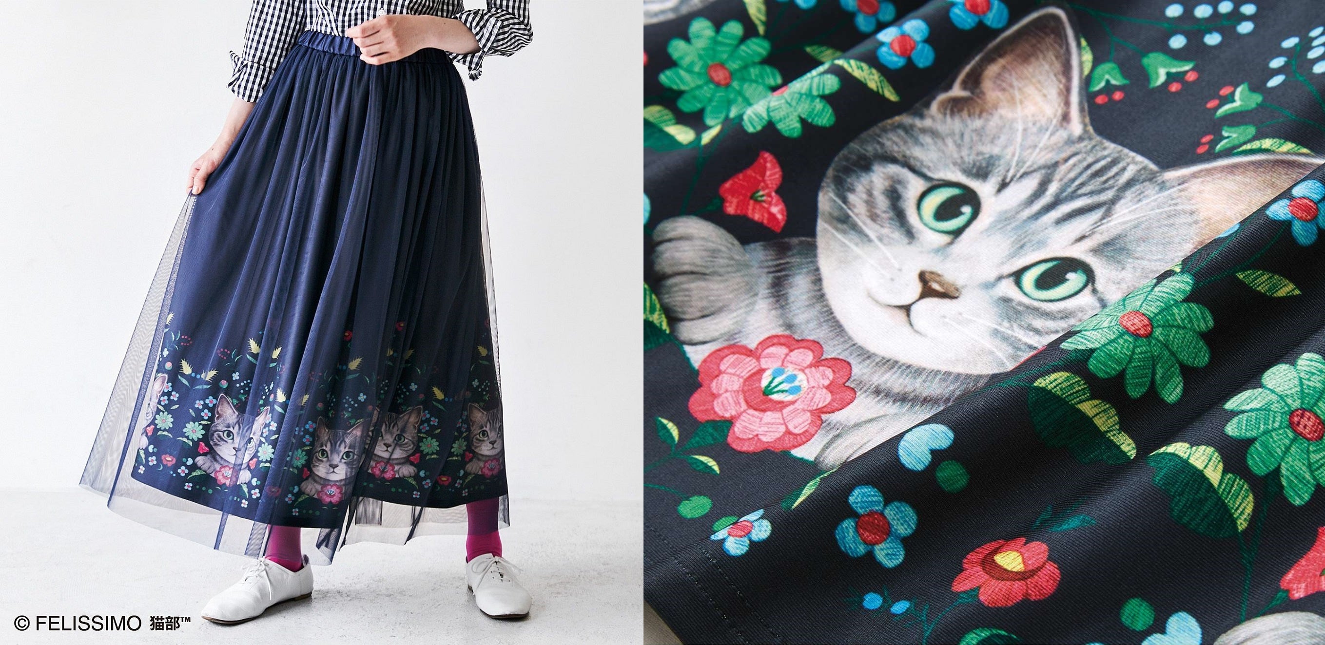 霜田 有沙さんの描く猫と、ハンガリーの伝統的なカロチャ刺しゅう風のお花をプリントしたスカートは、ダークネイビーのベースにチュールを重ね、シックかつ華やか。スニーカーやバレエシューズ、ブーツなど、何を合わせても決まります。