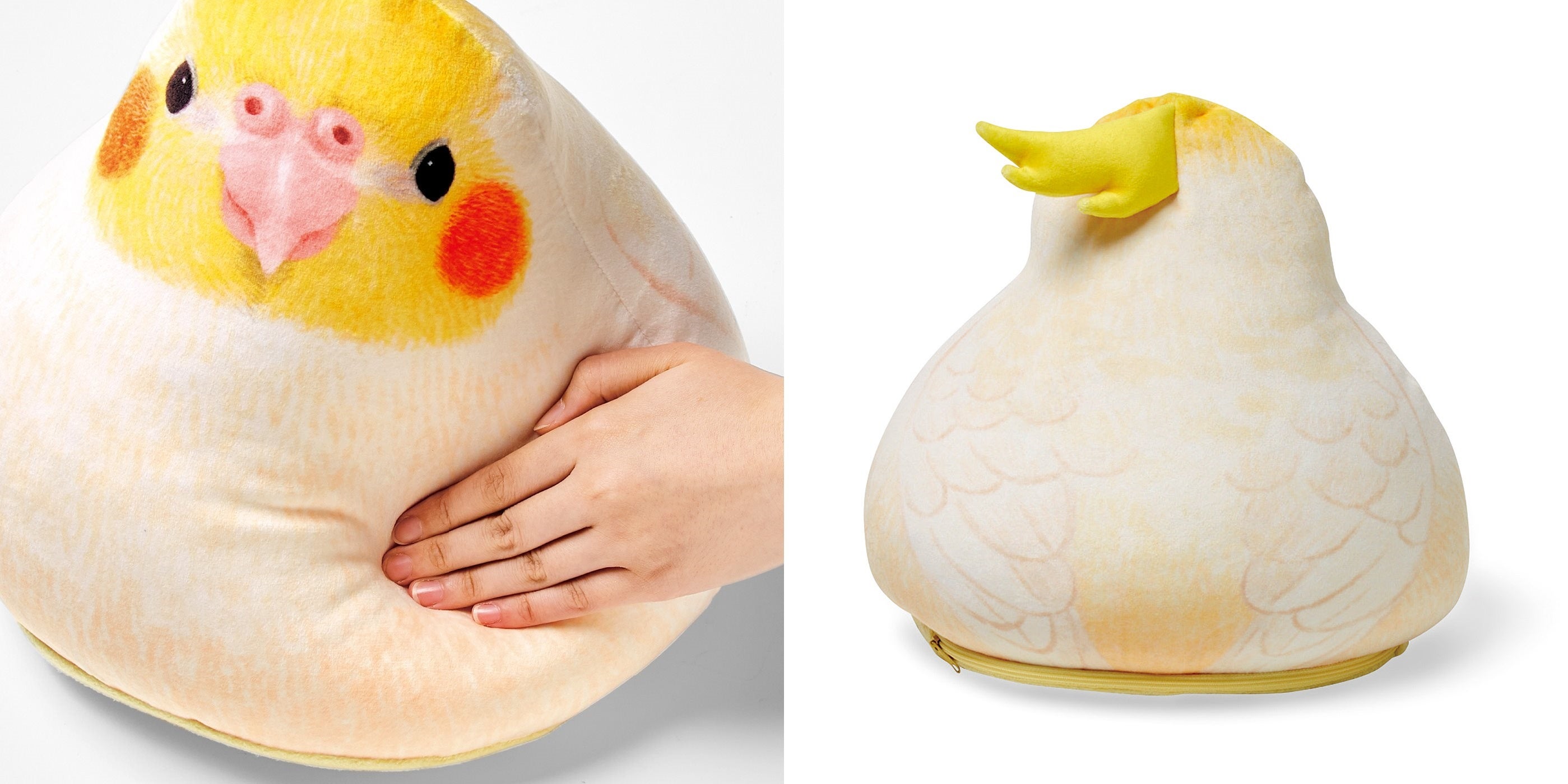 地面におなかをくっつけてリラックスしているインコ&オウムの姿をビーズクッションで再現した、もっちりおもちフォルムがたまらないクッションです。抱き心地も触感も◎。おしり部分にカイロを入れられるファスナーポケット付きで、まるで手のりインコの足もとのぬくもりをイメージして楽しめます。