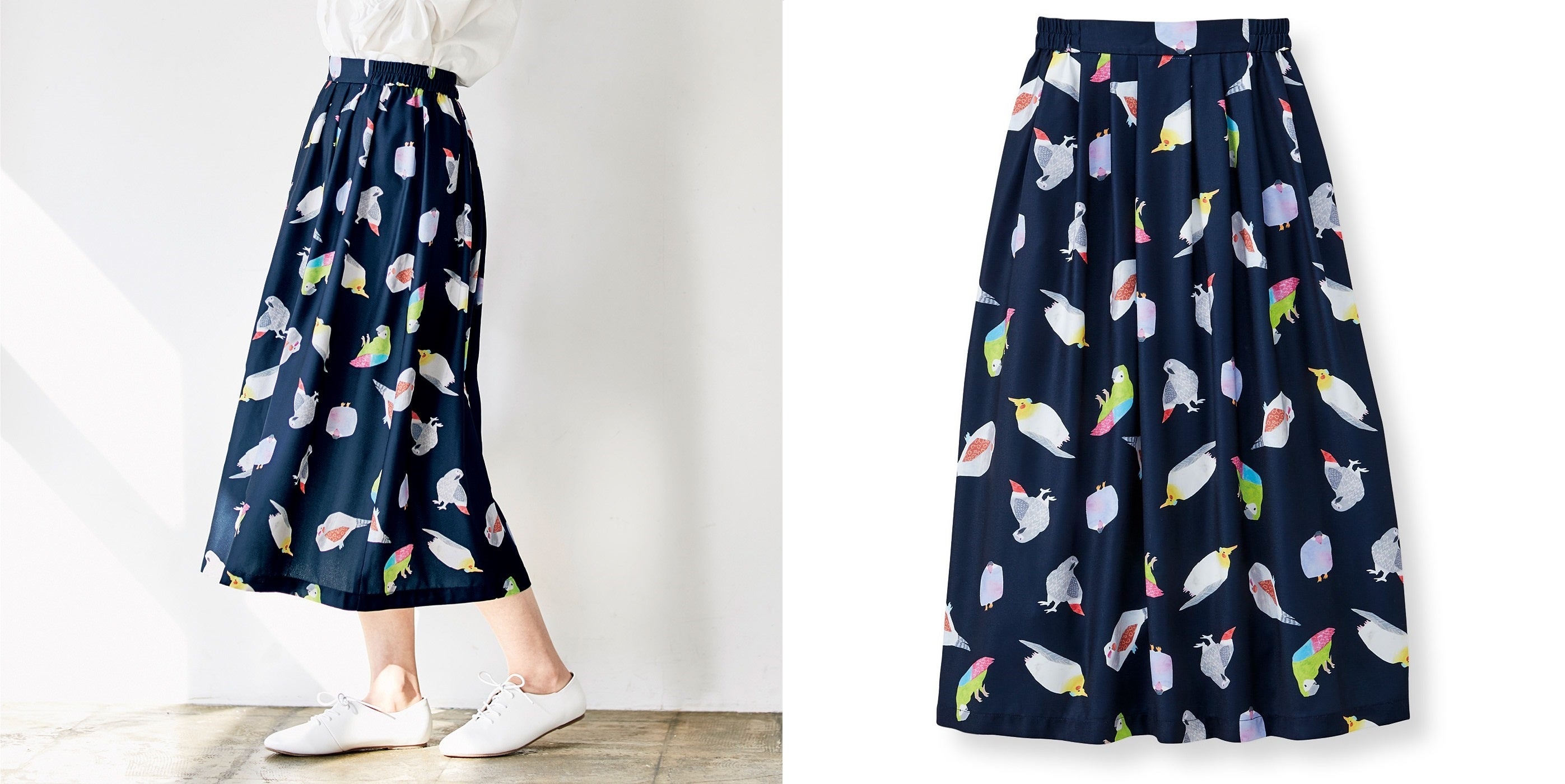 ネイビーのポリエステル素材にイラストレーター 山口ちよ子さんが描いた5種類の小鳥たちがプリントされた華やかなスカートです。合わせやすいミモレ丈で、サンダルやバレエシューズとも相性ばっちりです。