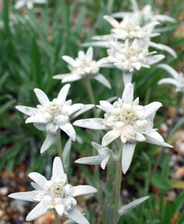 ヨーロッパアルプス、チロルやバイエルン地方の標高3,000m~3,500mの日当たりのよい岩場や草原に生育する多年草です。高さは、5cm~25cmほどと生育環境によって異なります。エーデルワイスとは、ドイツ語で「高貴な白」という意味です。当園に咲くエーデルワイスは、6月下旬頃までお楽しみいただける見込みです。