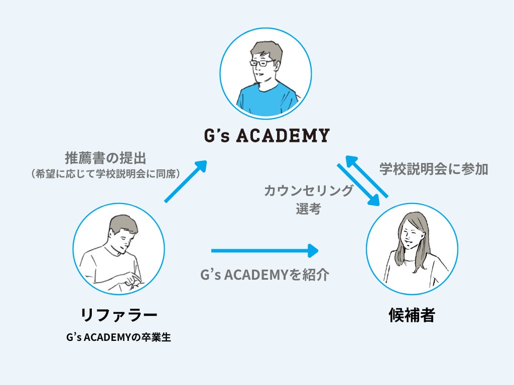 『G’s Referral Track』は、ジーズアカデミーの卒業生がリファラー(推薦人)となり、入学者を選び推薦する、いわゆる「推薦入試」に近い形式の入試制度です。