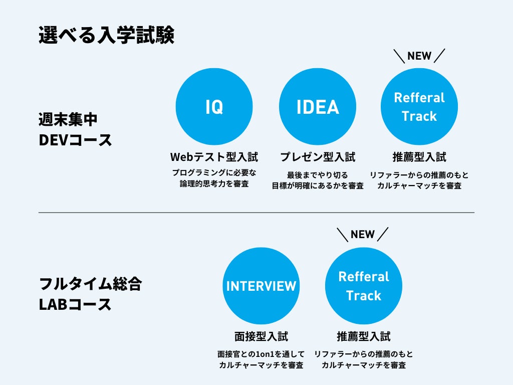 週末集中DEVコースでは論理的思考力を測るWebテスト型の「IQ試験」、または自身が作成したいWebサービスやアプリの企画発表を通して目標と熱意を審査するプレゼン型「IDEA試験」。フルタイム総合LABコースでは1対1でカルチャーマッチを審査する面接型の「INTERVIEW試験」を実施しています。