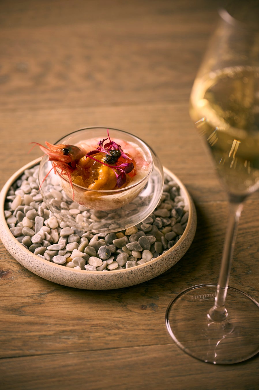 コースのスタートには鮮やかな魚介のマリネをあしらった十勝玉ねぎのエスプーマと経産牛のタルタルと漬け卵黄を合わせたそば粉のチュイルが登場。シャンパーニュを合わせて贅沢気分を満喫できます。