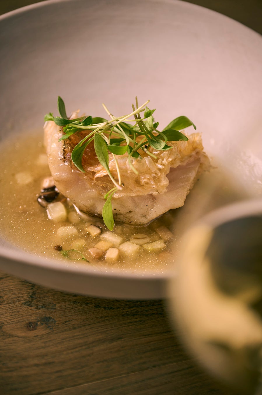 甘鯛 松笠焼 大麦と冬野菜のタブレ 経産鶏のスープ