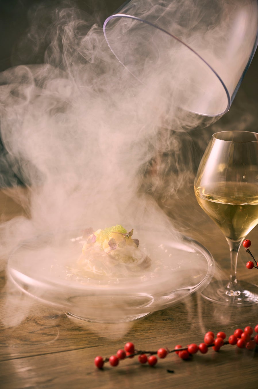 スモークを纏った中トロに金柑、カブ、ゆずをあわせた調味料、とびっこわさび、リコッタチーズを和えて和洋折衷の味わいに仕上げました。蓋を開ける瞬間にスモークが広がるサプライズな演出にも注目です。