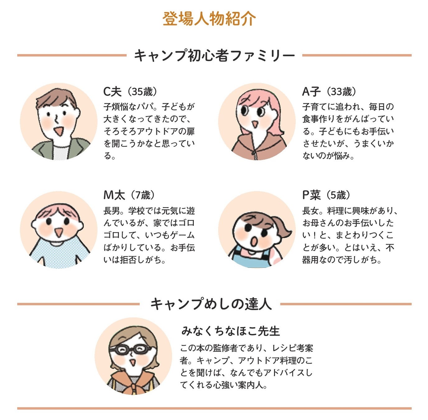 案内役は、アウトドアクッキングのトップランナーとして知られるみなくちなほこさん。幼少期からキャンプに親しみ、現在はキャンプギアメーカーのカタログやイベントにも携わっています。そんなみなくちさんが、マンガの登場人物であるキャンプ初心者ファミリーに「キャンプめし」作りを指南。