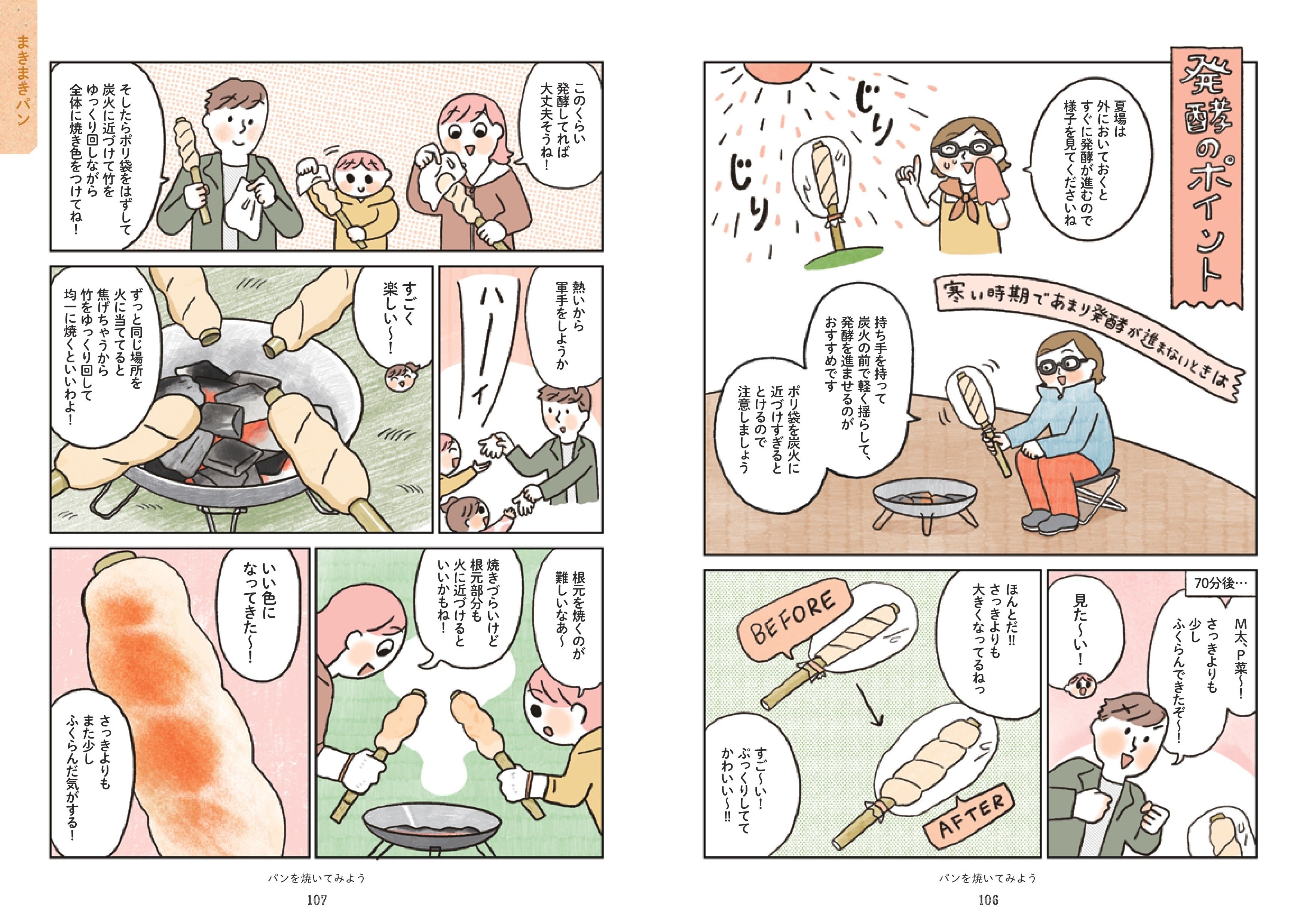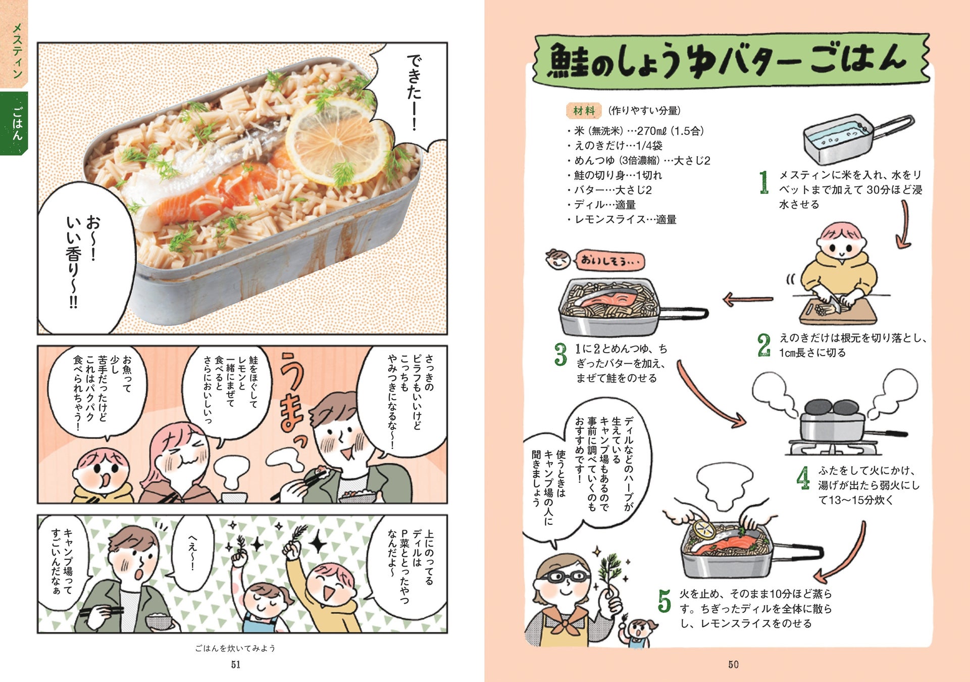 マンガのストーリーが進むにつれ、ファミリーが「キャンプめし」作りをだんだんマスター。道具選びから、メニュー決め、火おこし、調理のコツ、後かたづけまで、本書を読み終えたときには「キャンプめし」で知りたいことが一通りわかっているという次第。