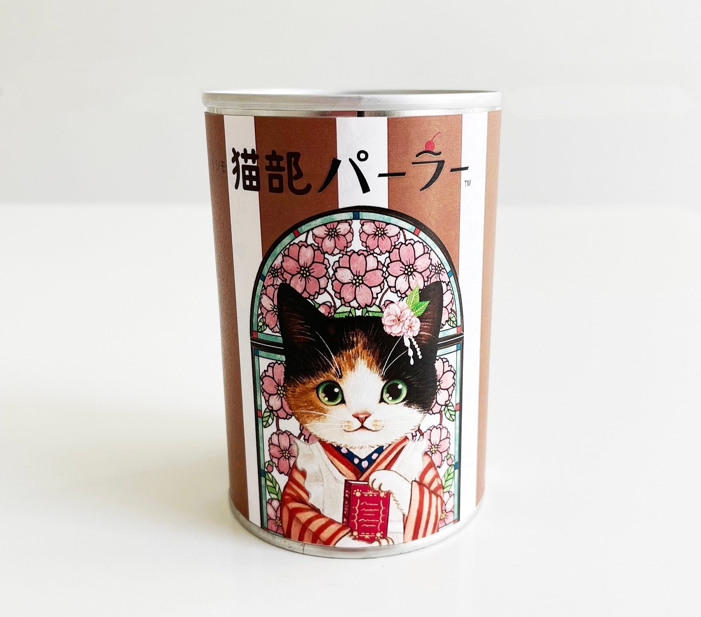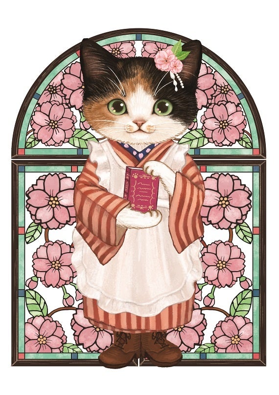 大正浪漫なステンドグラスをバックに、愛らしいお着物を着た三毛猫さん「よしのちゃん」が、猫部でおなじみのイラストレーター霜田有沙さんの描きおろしイラストで誕生。秋葉原和堂の名物「八重桜ブレンド珈琲」をイメージし、静かに読書をするのにおすすめの空間にマッチした、洋書を手にしたデザインです。コラボカフェ開催期間中は、よしのちゃんと一緒に、写真を撮影できるブースが登場します。
