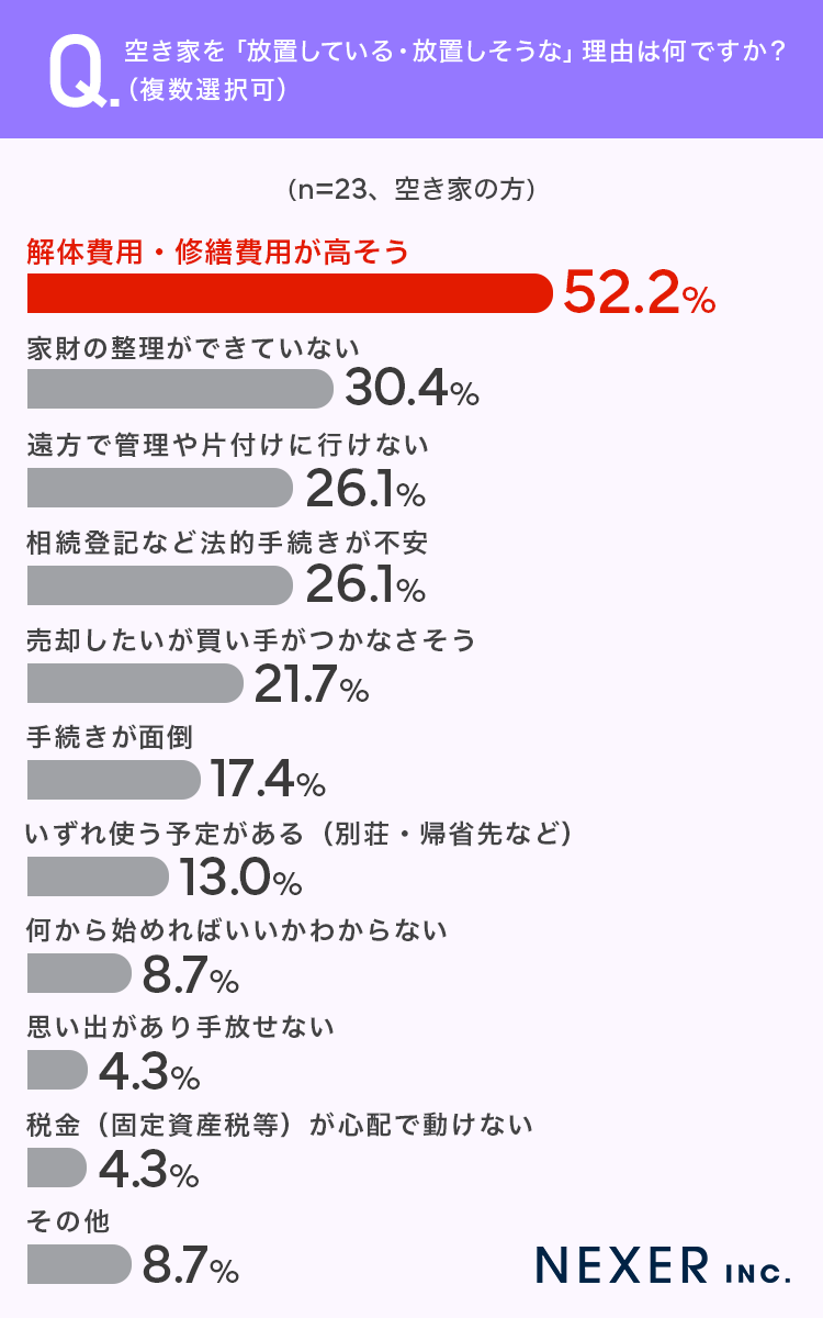 次いで「家財の整理ができていない」で30.4%、「遠方で管理や片付けに行けない」と「相続登記など法的手続きが不安」が同率の26.1%で並びました。