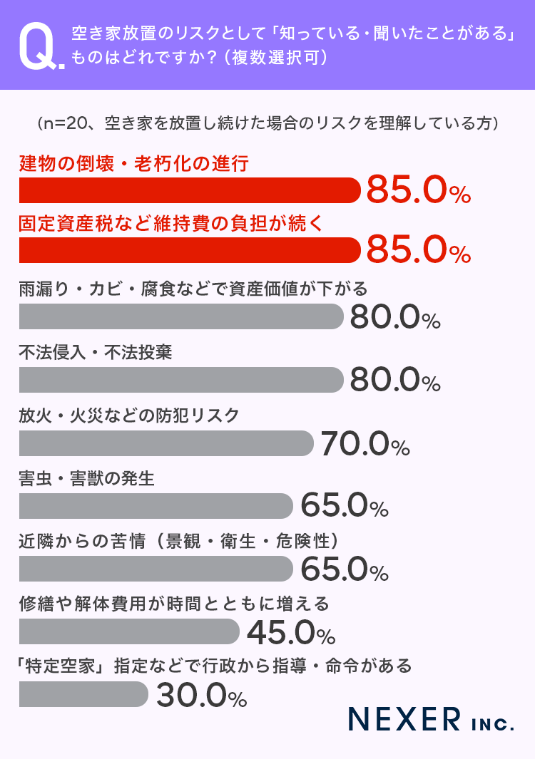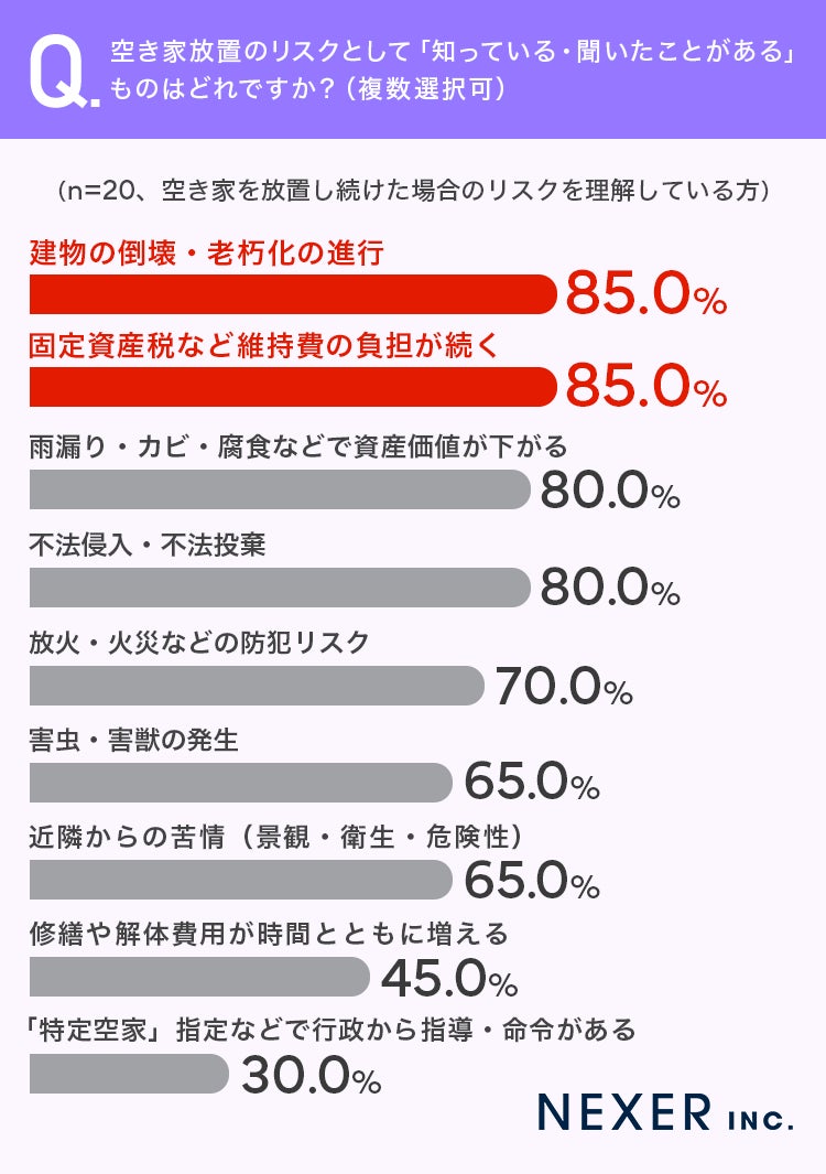 最も多かったのは「建物の倒壊・老朽化の進行」と「固定資産税など維持費の負担が続く」で、いずれも85.0%でした。次いで「雨漏り・カビ・腐食などで資産価値が下がる」と「不法侵入・不法投棄」がそれぞれ80.0%で並んでいます。