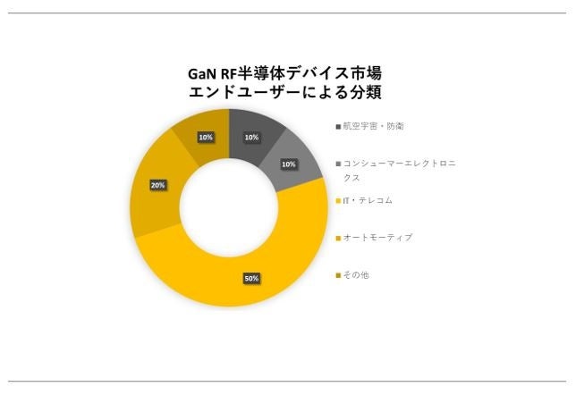 エンドユーザーに基づいて、、IT・テレコムは予測期間にGaN RF半導体デバイス市場の収益で大きなシェアを占めると予想されます。このサブカテゴリーの成長の主な理由は、5Gハンドセット、ネットワークインフラ機器、携帯電話やノートパソコンなどの民生用電子機器の需要の増加が、IT&テレコム分野の成長を牽引していることです。例えば、インド経済におけるIT&ビジネスサービスは、2025年までに200億米ドルを超えると予想されています。2022年4月、インドの通信密度は85%に達し、ブロードバンド総加入数は785百万件、総加入者数は112億人に達しています。また、テクノロジーの急速な発展とインターネットやモバイル技術の台頭により、人々や企業間のコミュニケーションがより効率的に行われるようになり、これらの分野が盛んになることが予想されます。