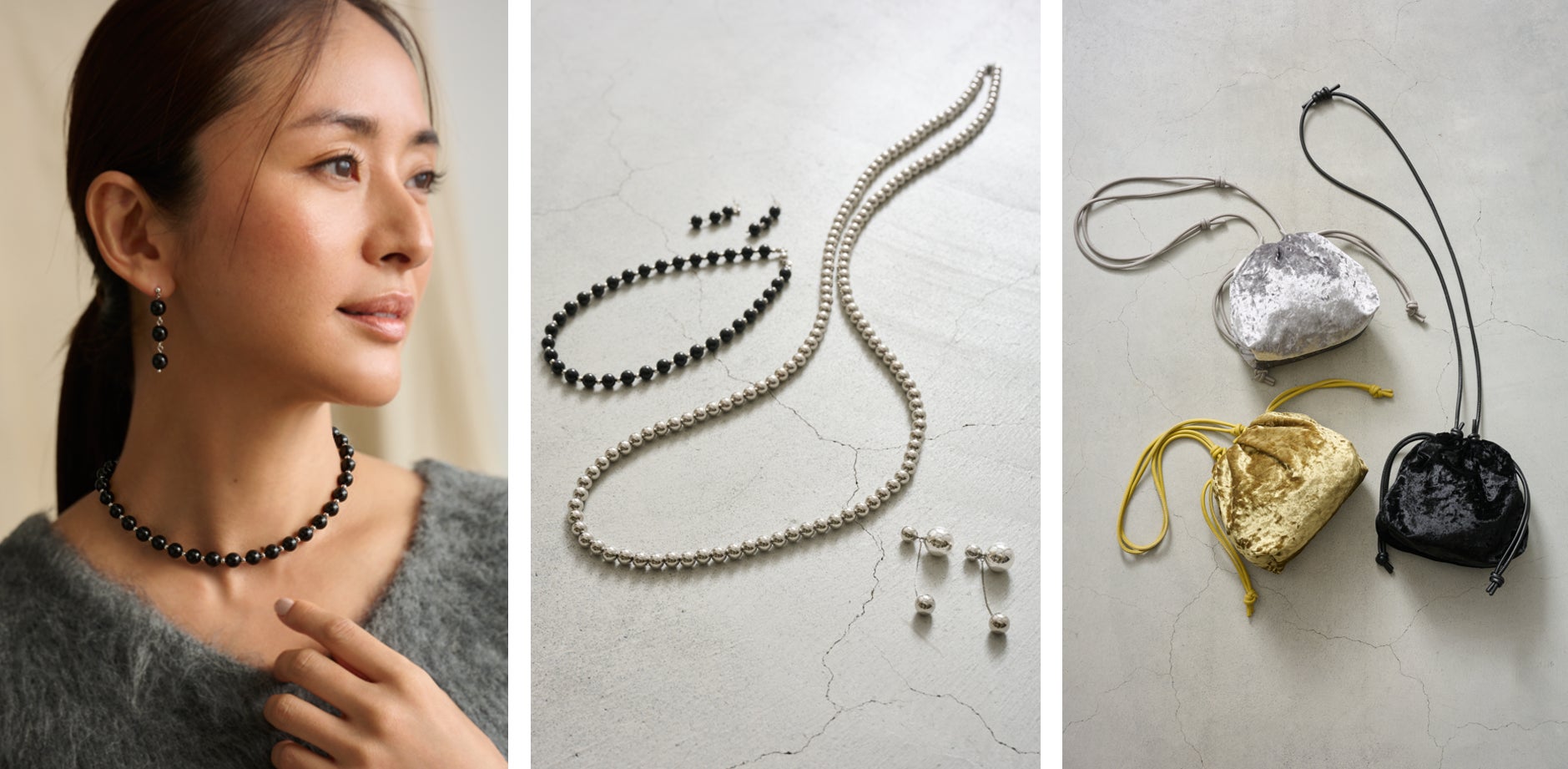さらに、福田さんがディレクションを担当し、2人のアシスタント・太田恵理さんと田中弥怜さんと共に立ち上げたアクセサリーブランド「EMMN(エムン)」とのコラボレーションアクセサリー(WEB限定商品)やバッグも同時発売。特別な日をより一層華やかに彩るホリデー別注アイテムがそろいました。