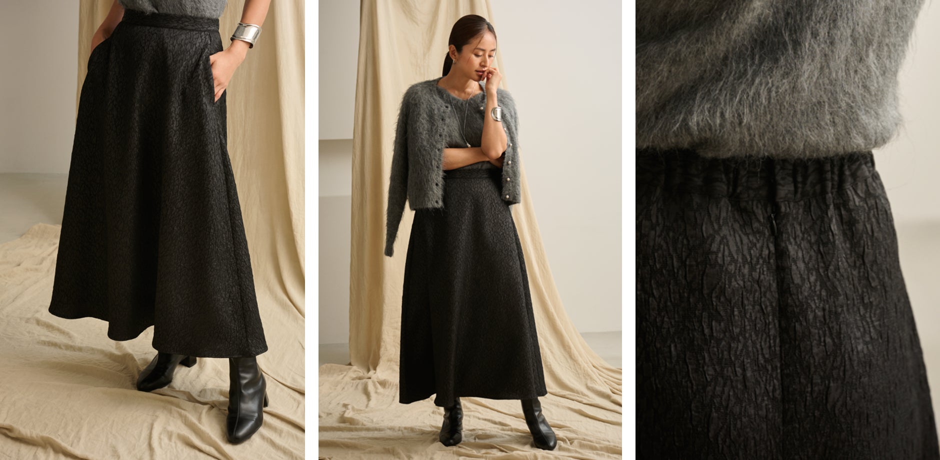 大人女性の上品さを演出しながらも、さりげない遊び心も感じるジャガード素材を採用。