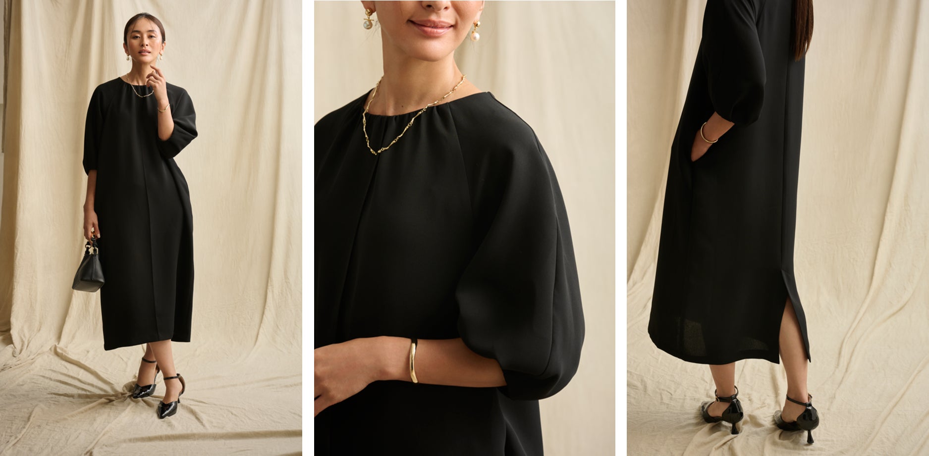大人が着るに相応しい、1枚で決まるドレスワンピース。身体のラインを美しく魅せるコクーンシルエット、深みのあるブラック、落ち感のある素材が大人女性の品を際立たせます。立体感のあるシルエットは体型を選ばず、着痩せを叶えてくれます。さらに、襟まわりのギャザーデザインは首や肩をすっきり見せてくれるので、上半身の華奢見えも期待できます。